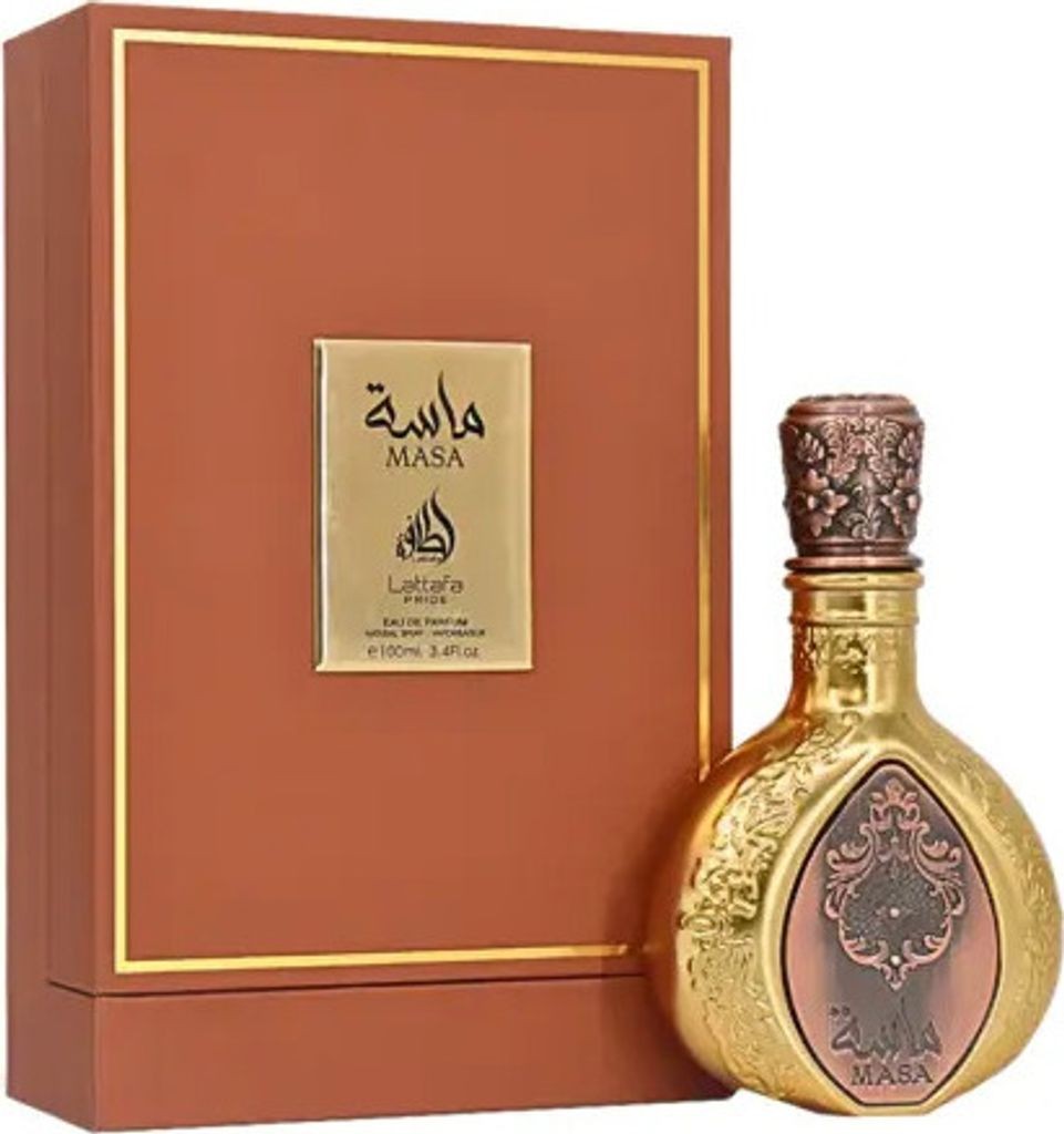 Masa de Lattafa Perfumes este un parfum Floral Fructat unisex. Acesta este un parfum nou Masa a fost lansat in 2023. Notele de varf sunt mango, sofran, lamaie si piper roz; notele de mijloc sunt frunza de violeta, osmanthus, ghimbir si floare de portocal; Notele de baza sunt note minerale, piele intoarsa, paciuli si ambra.